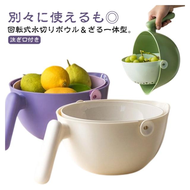 | 回転式水切りボウル&ざる一体型。別々に使えるも◎【注ぎ口付き】 片手で簡単に水切りができて機能性抜群 もちろんザルとボウル別々に使えて、お手入れも簡単・便利 おしゃれなバイカラーが魅力的であなたのキッチンに合わせて色が選べます | |