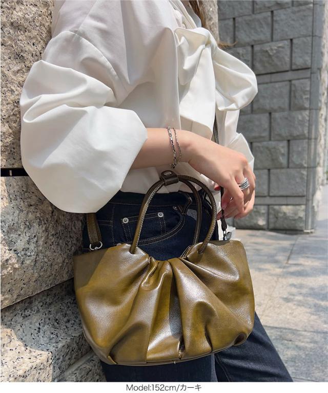 コーデのアクセントにぴったり。ギャザーデザインが可愛いフェイクレザーバッグ。ツヤ感のあるフェイクレザー素材が高見えし、カジュアルにもきれいめにもマッチする万能デザイン。開口部はマグネット+ファスナー仕様で中身の飛び出しも防ぎ、実用性も◎取り外し可能なショルダーストラップ付きで、手持ちでも斜めがけでも楽しめる2WAY仕様です。【素材・サイズ感】スマホやミニ財布、ハンカチなど、必要なアイテムがすっきり収まるちょうどいいサイズ感。ギャザー入りの丸みを帯びたフォルムは中身が見やすく、開け閉めもスムーズで使い勝手◎ショルダーストラップは取り外し&長さ調整が可能で、手持ちでも斜めがけでも気分に合わせてアレンジできます。普段使いからお出かけコーデのアクセントまで、幅広く活躍してくれるアイテムです。※キャンセル/変更不可※※お届けまでの日程について
