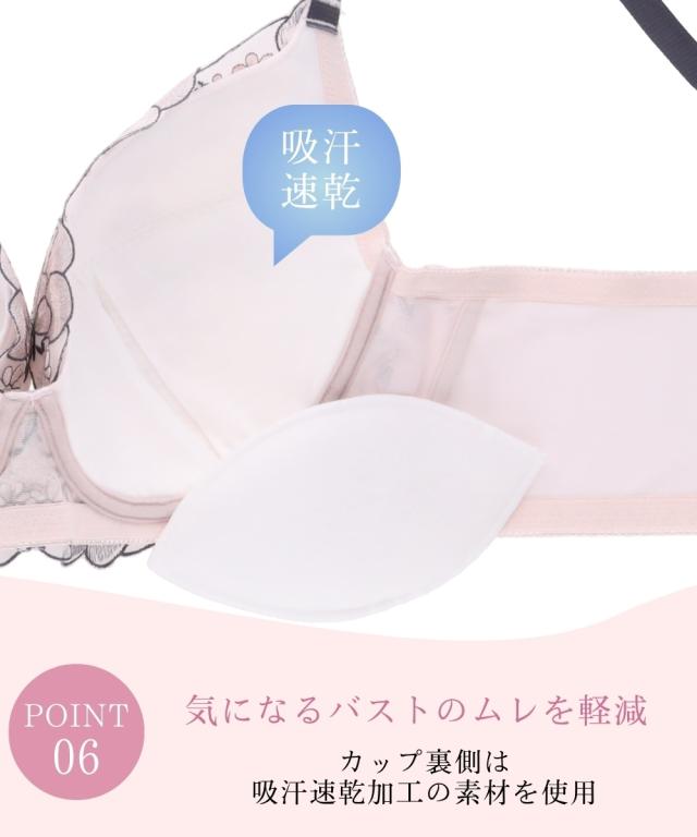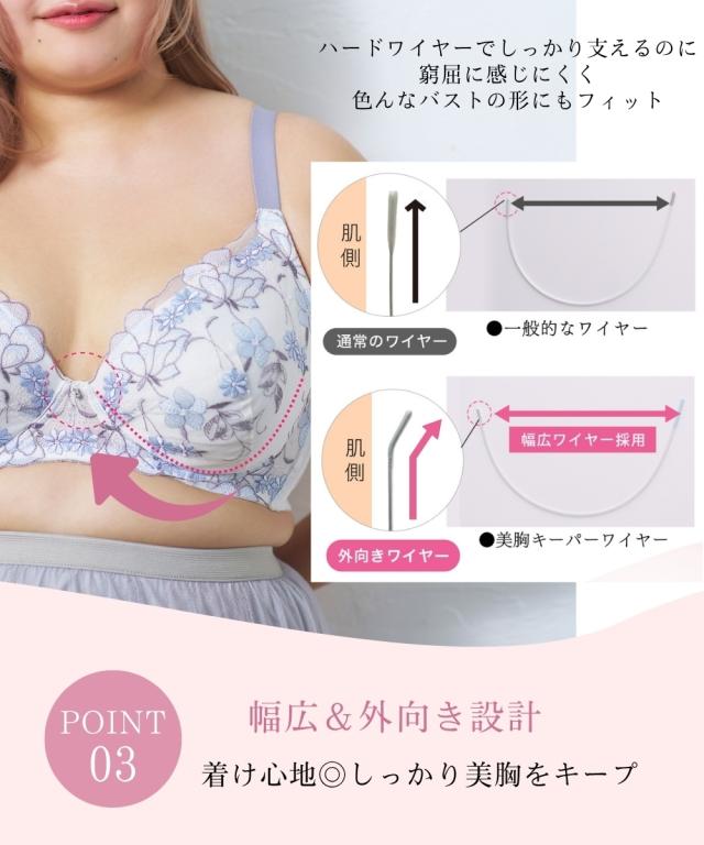 ストラップがズレ落ちにくくなりました! ぽっちゃり体型に合わせた専用パターンを採用! グラマーバストをしっかりホールド。 バストの横流れを防ぎキレイなシルエットをキープ。 可憐さのある花とピュアで可愛さのある小花をMIXした刺繍柄。 アウトラインで囲まれた花柄が目を引きます