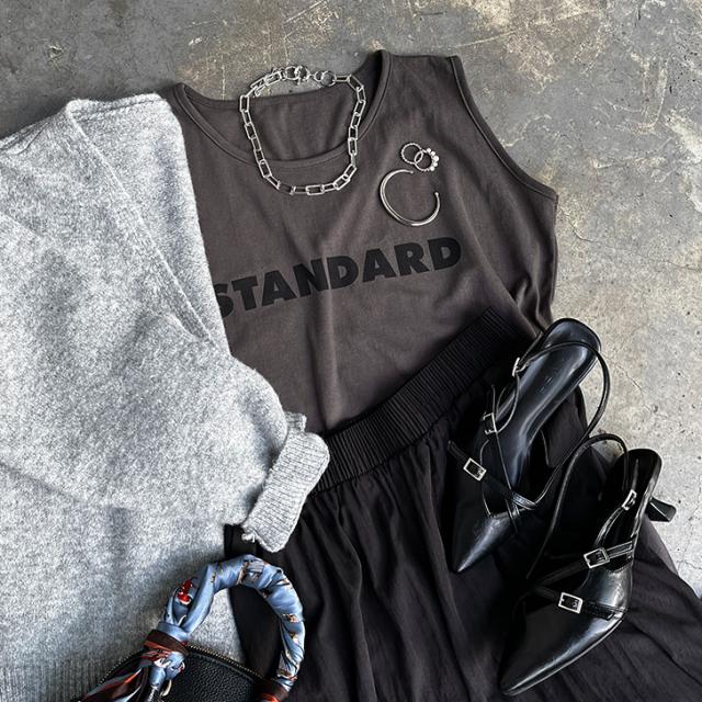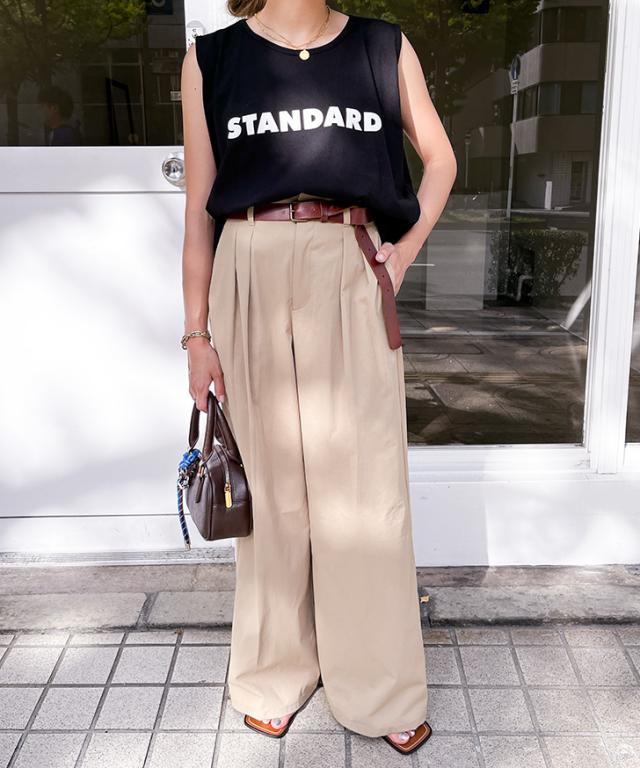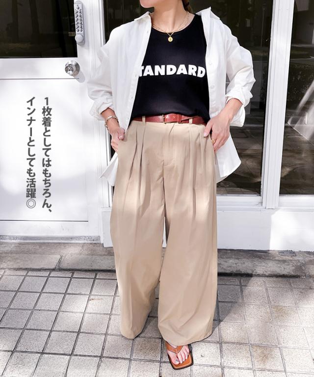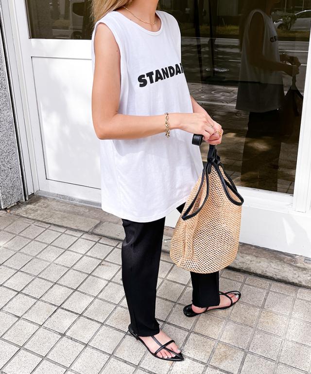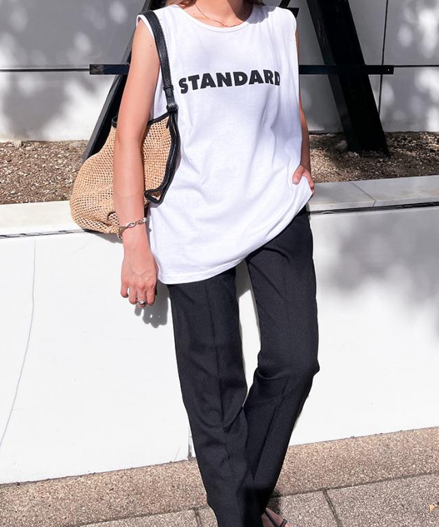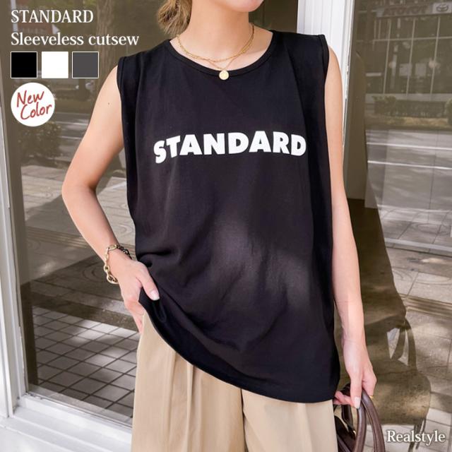 STANDARDロゴプリントノースリーブワイドカットソー レディース トップス タンクトップ ゆったり 涼しい 涼感 夏 綿100% コットン100% 薄手 大きめ カジュアル おしゃれ オフィス デイリー シンプル ロング丈 着回し ロゴT プリントT クルーネック 丸首 ゆるシルエット 普段着 大きい 体型カバー 楽ちん ストリート 韓国 定番 ロゴTシャツ プリントTシャツ ロゴプリントT ノースリーブTシャツ 袖なし ゆるT チュニック 長め 長い 軽量 軽い ラウンドネック ホワイト ブラック 白 黒 白T 黒T 普段使い 韓国ファッション ナチュラル 可愛い かわいい かっこいい 快適 吸汗性 吸水 英字 英語 ワンマイル 通勤 通学 学校 仕事 会社 部屋着 パジャマ 寝巻 スポーツ 運動 アウトドア レジャー スポーティー ジム ヨガ フィットネス 野外 街着 散歩 ジョギング ランニング ヒップホップ 衣装 レッスン 練習着 k-pop イベント コンサート ライブ フェス ポップ 新生活 新学期 学校 中学生 高校生 学生 大学生 大人 女性 婦人 10代 20代 30代 40代 50代 暑さ対策 熱中症対策 スーツインナー SNS 映え 動きやすい シンプルTシャツ ワンポイント 柔らか やわらか ティーシャツ ティシャツ ロゴティー ルーズ ルーズT プルオーバー ママコーデ ママファッション 妊婦 マタニティ ぽっちゃり 大人世代 旅行 トラベル お花見 ピクニック オフィスカジュアル 高見え 買い物 ショッピング 人気 トレンド 流行り 流行 春 秋 春夏 晩夏 猛暑 酷暑 初秋 秋口 肌見せ 肌出し ベーシック スタンダード スタンダードT お腹カバー ぽっこりお腹カバー ヒップカバー お尻カバー