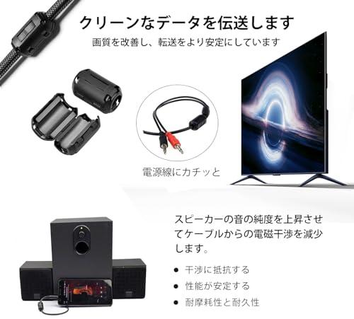 【ノイズ除去】パソコン、モニター、テレビなどの周辺で使用されているケーブルに設置するだけで、フェライトコアの高周波吸収特性が効いて高周波ノイズが除去されます。電磁放射をより効果的に抑制するために、干渉源の近くに設置してください。