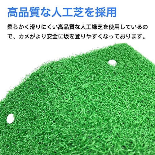【登りやすい傾斜台】自然の生活環境に近づけた傾斜に設計し、柔らかく滑りにくい高品質な人工緑芝を使用しているので。シミュレーション水草は亀と草の摩擦を大きくし、科学的で合理的ななだらかな斜面設計により亀が登りやすくなっています。