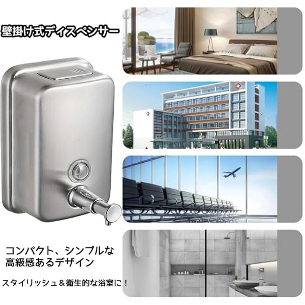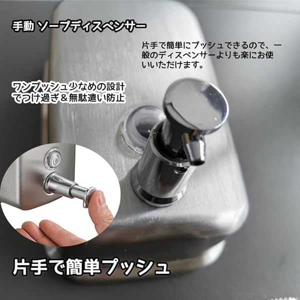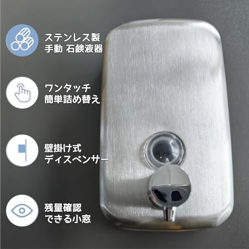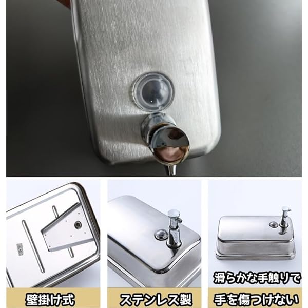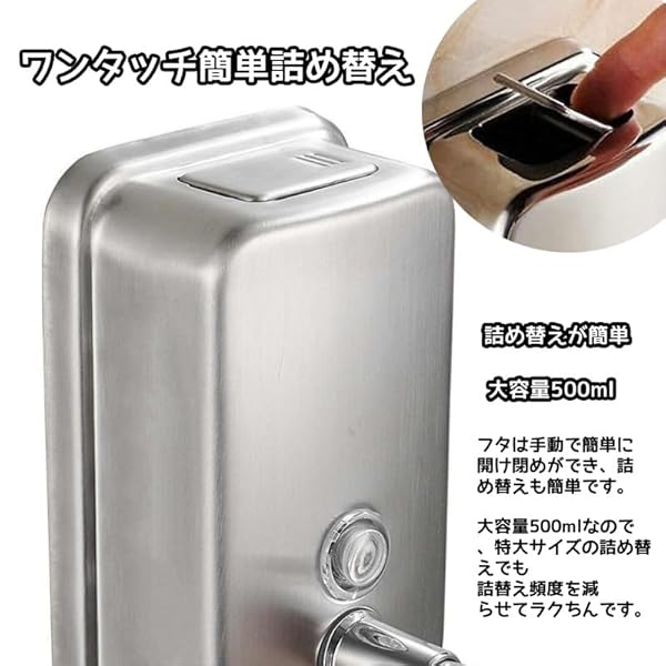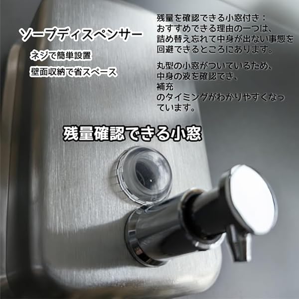 【設置方式】壁掛けタイプポイント1:ボトル部分が、目盛りがついているものは、ソープの残量をすぐに確認できる ポイント2:ワンタッチ簡単詰め替え:タンク上部の蓋を回転させ注入口から詰め替えるだけ! ポイント3:シンプルでスタイリッシュな雰囲気のステンレス製
