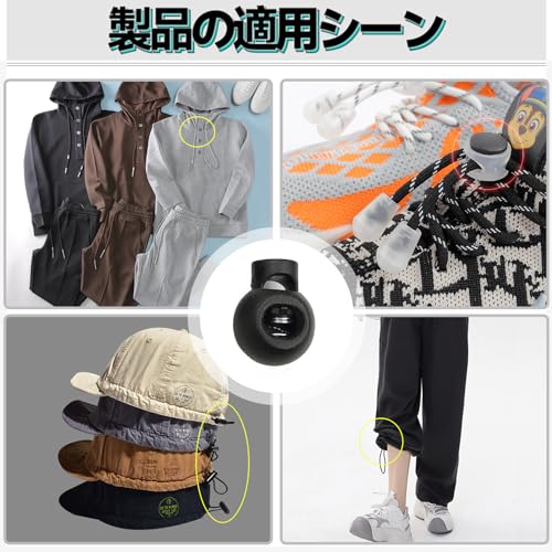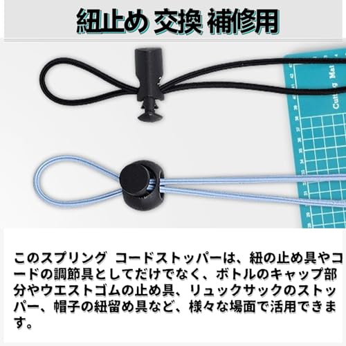 【幅広い使い道】このスプリング コードストッパーは、紐の止め具やコードの調節具としてだけでなく、ボトルのキャップ部分やウエストゴムの止め具、リュックサックのストッパー、帽子の紐留め具など、様々な場面