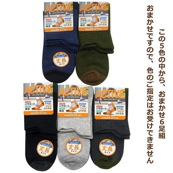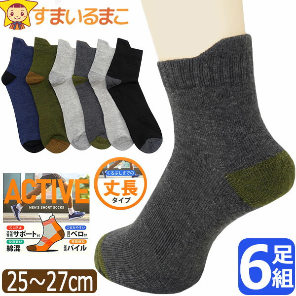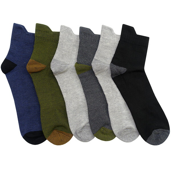 靴下 メンズ 6足 セット ロークルー丈 ソックス 綿混 足底パイル 丈長 つまみ付き Wサポート 25〜27cm 色おまかせ set1429 メール便は送料無料 紳士 男性 くつした くつ下 6足組 クルー丈 ロークルー丈 無地 シンプル カジュアル スポーツ 通勤 通学 足 まとめ買い