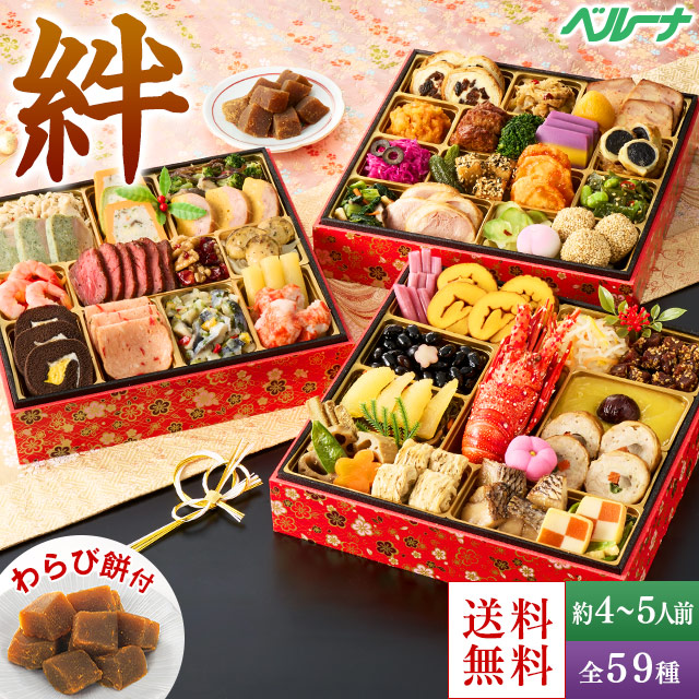 おせち 予約 2026 おせち料理 冷凍 4人前 5人前 ベルーナ 絆 和風 洋風 中華 三段重 全59種 和洋中 プレゼント付 12月29日お届け 【送料無料】