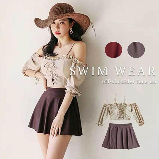 水着 レディース 2点セット ビキニ かわいい 韓国 オフショル カップ 二の腕カバー セパレート ベージュ ブラウン レースアップ お洒落 海 ビーチ