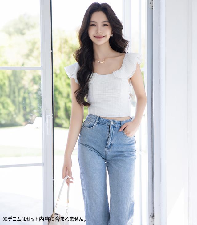 ボリュームのあるフリルスリーブが顔周りを華やかに見せ肩、腕周りの華奢見え効果も。