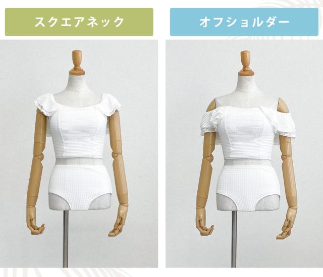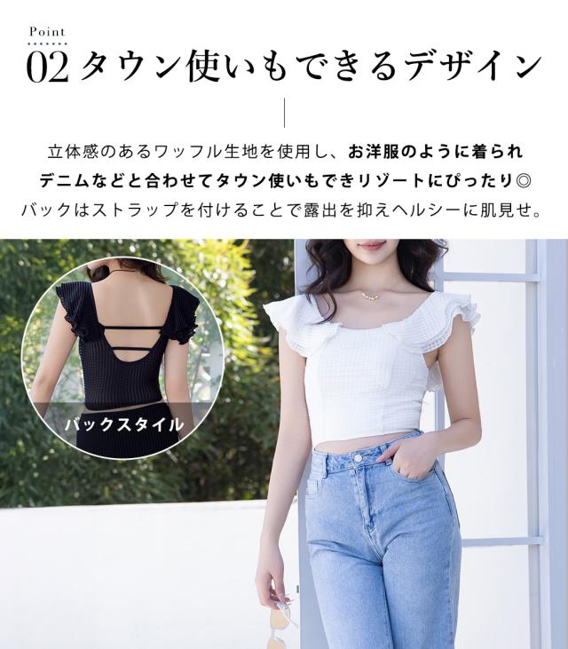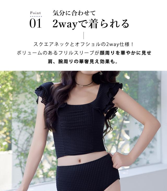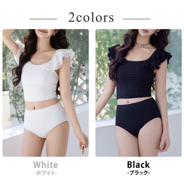 ビキニ 水着 レディース 2点セット セパレート ビスチェビキニ フリル ハイウエスト ショーツ ワッフル生地 2way オフショルダー スクエアネック ノンワイヤー 一体型モールドカップ バックオープン バックシャン ストラップ 白 黒 海
