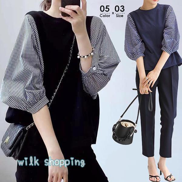 Tシャツ レディース ドッキングトップス 切り替えブラウス 長袖 七分袖 千鳥チェック 夏服 可愛い バックゴム 無地 黒tシャツ 女の子 大人
