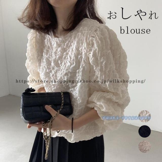 フリル ブラウス 長袖 春 秋物 長袖ブラウス プルオーバー ボリューム袖 トップス レディース おしゃれ ラウンドネック tシャツ シャツブラウス ベージュ 黒