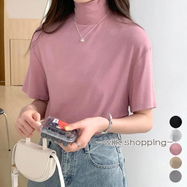 首元がハイネックデザインのシンプル五分袖Tシャツ