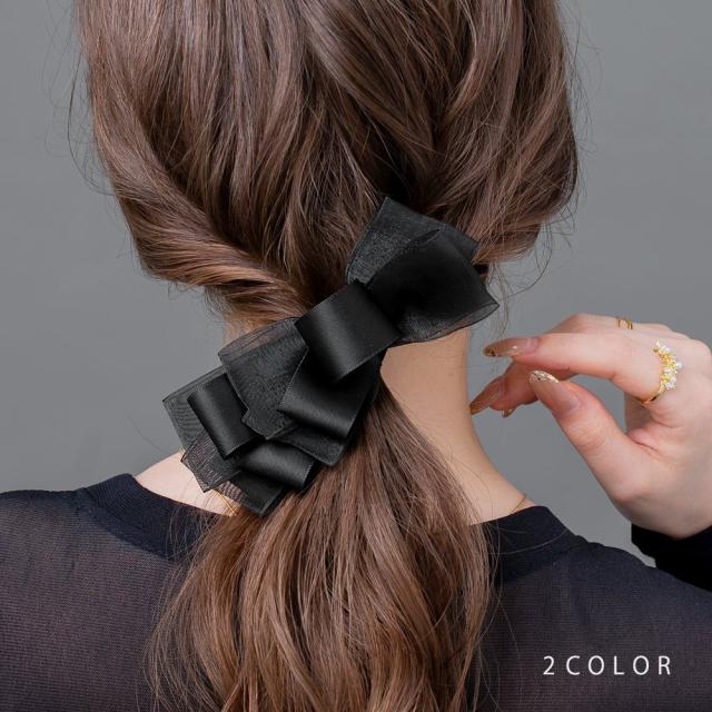 【ゆうパケット送料無料】 バレッタ リボン アシンメトリー 艶 透け感 異素材 レイヤード ヘアクリップ 多重リボン オーガンジー ヘアアクセ ヘアアレンジ 簡単 まとめ髪 髪留め 大人 ブラック ブラウン