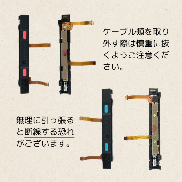 交換の際にはケーブルの取り扱いにご注意ください。Joy-Con内部には非常に細いフレキシブルケーブルが多数あります。