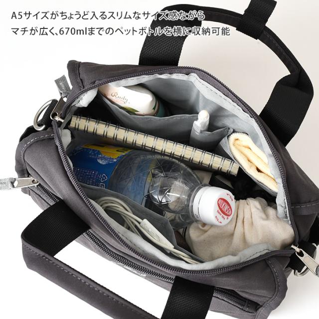 A5対応サイズ&広めのマチで、670mlペットボトルも横に収納可能
