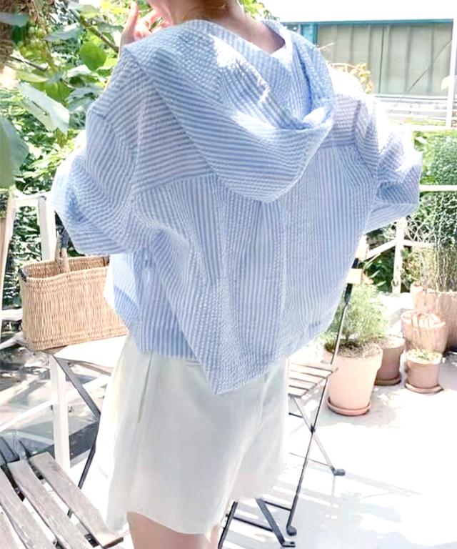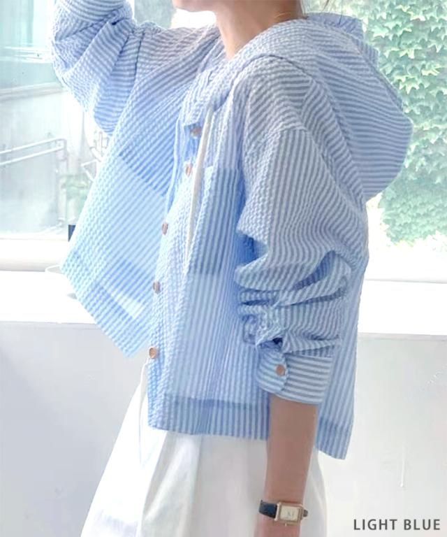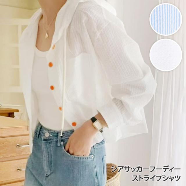 新作 胸ポケット付きシアサッカーフーディーストライプシャツ レディース 夏 薄手 長袖 アウター ゆったり ブラウス トップス 羽織 上着 パーカー フード 前開き 涼しい 軽量 シースルー おしゃれ アウトドア