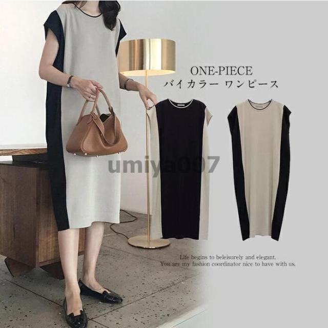 バイカラーワンピース 春 夏 半袖 バイカラー ワンピース レディース ロング きれいめ 膝下 大きいサイズ 秋 ワンピ 体型カバー 着痩せ ゆったり