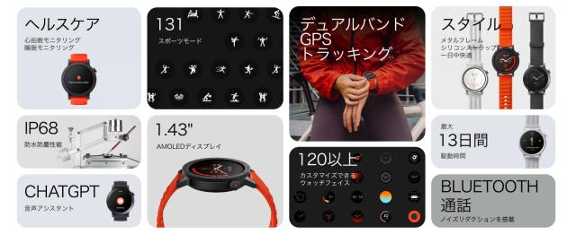 150種類以上の動く文字盤に加え、AIがスタイルや気分に合わせて自動でフェイスを提案。お気に入りの写真や動画も文字盤に設定可能。1.43インチAMOLED画面で明るく見やすく、ビジネスもスポーツもスタイリッシュに。