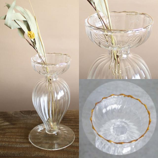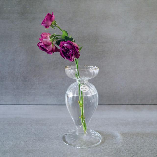 ゴールドのふちがポイントの一輪挿しです。シンプルなデザインなので、お庭で摘んだ草花でも素敵に飾ることができます。繊細で清楚なガラスのデザインは、どんなお部屋にも調和します。