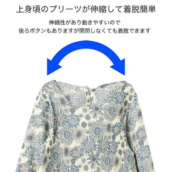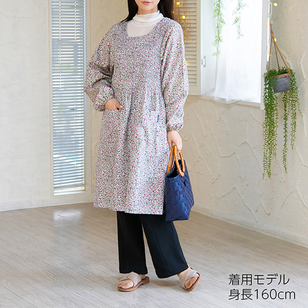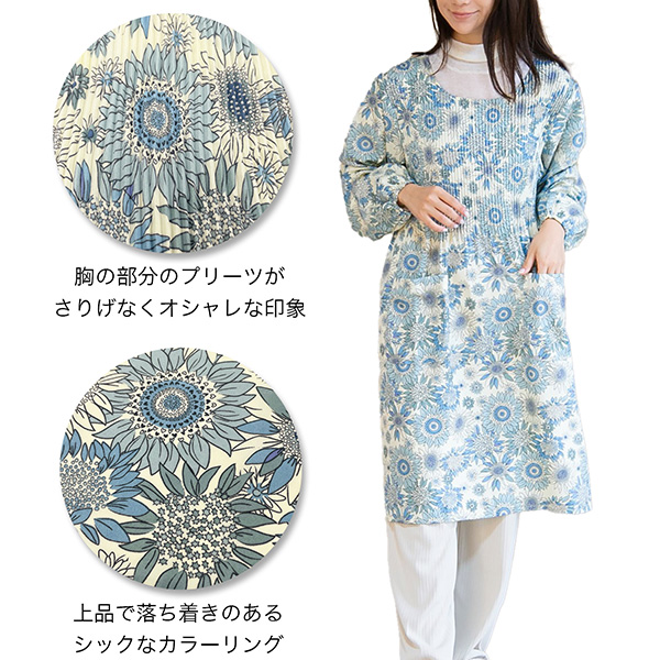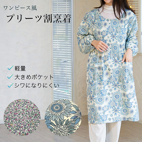 送料無料 ワンピース風 プリーツ 割烹着‐エプロン かっぽう着 花柄 保育士 おしゃれ かぶるだけ ロング丈 ポケット付き 母の日 敬老の日