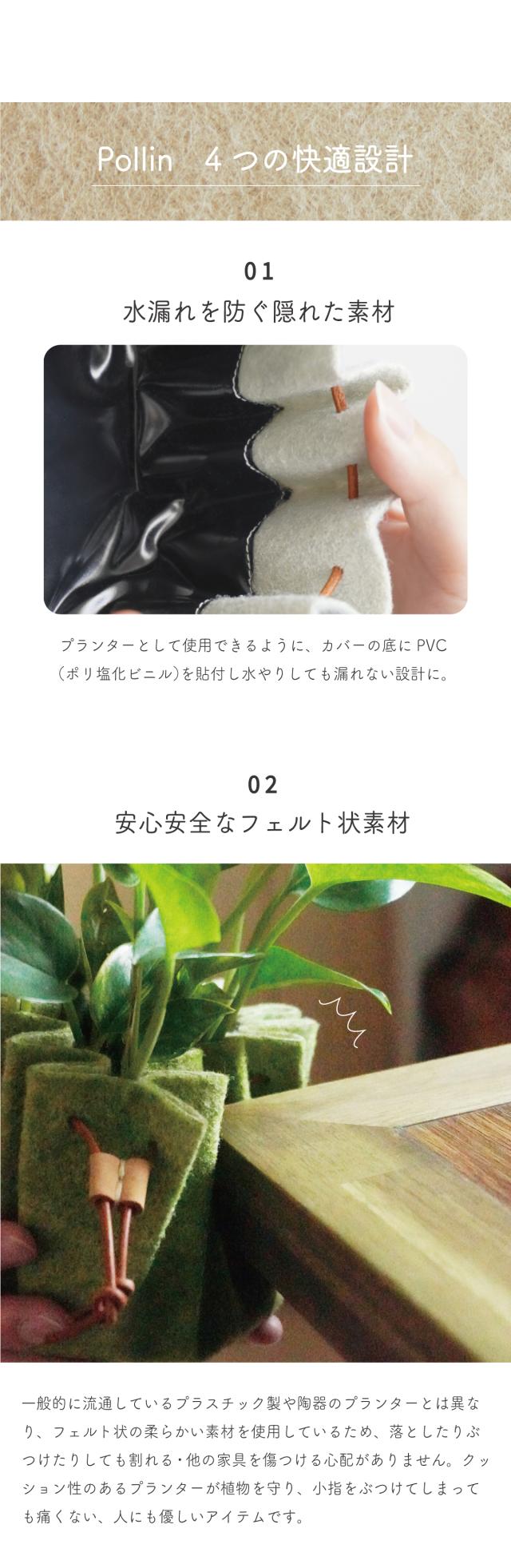 Pollinに使用しているフェルト状の素材は、耐久性に優れており、軽くて丈夫。しなやかでクッション性も兼ね備えており、万が一落としてしまっても欠けたり割れたりしないため、床や家具を傷つけにくく安心。ペットや小さなお子さまがいるお部屋でも植物を安心して気軽にお楽しみいただけます。