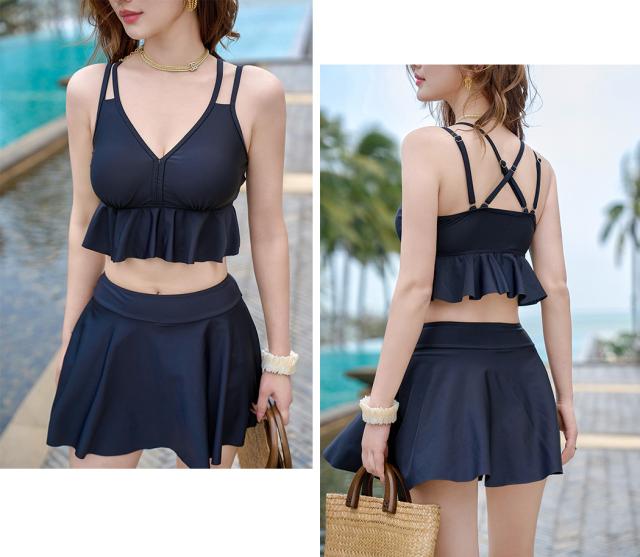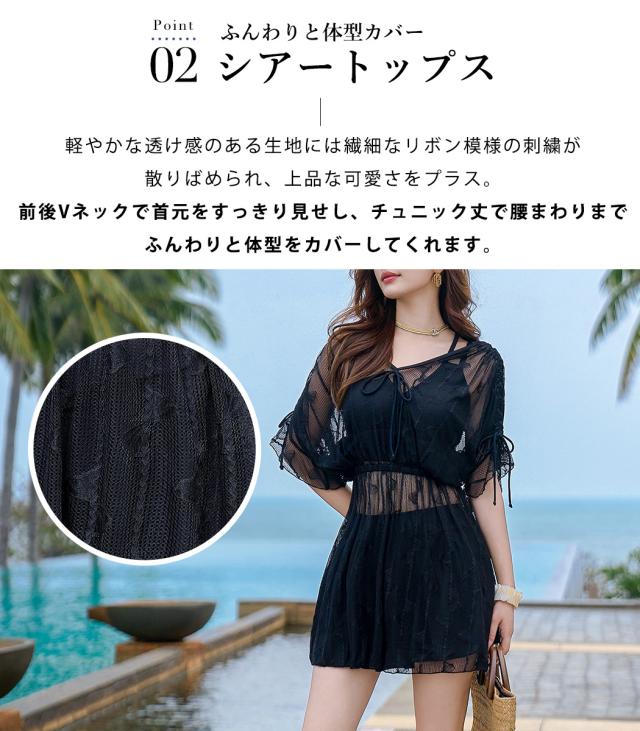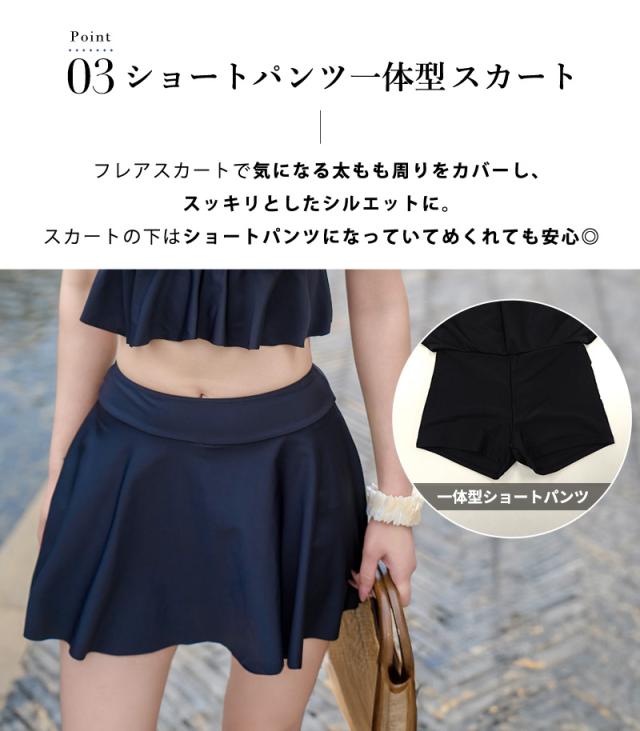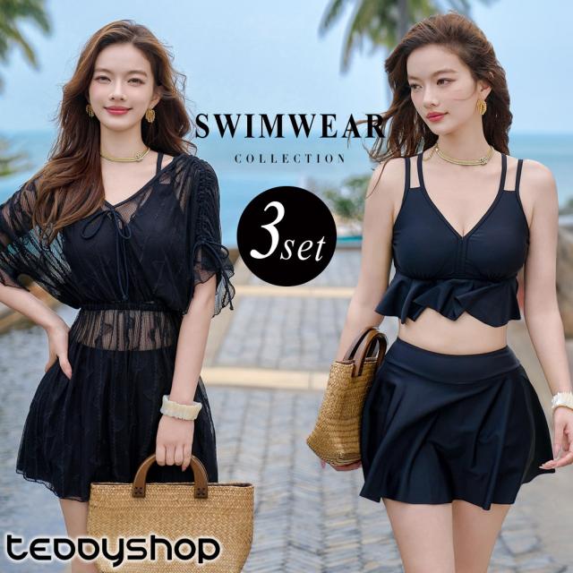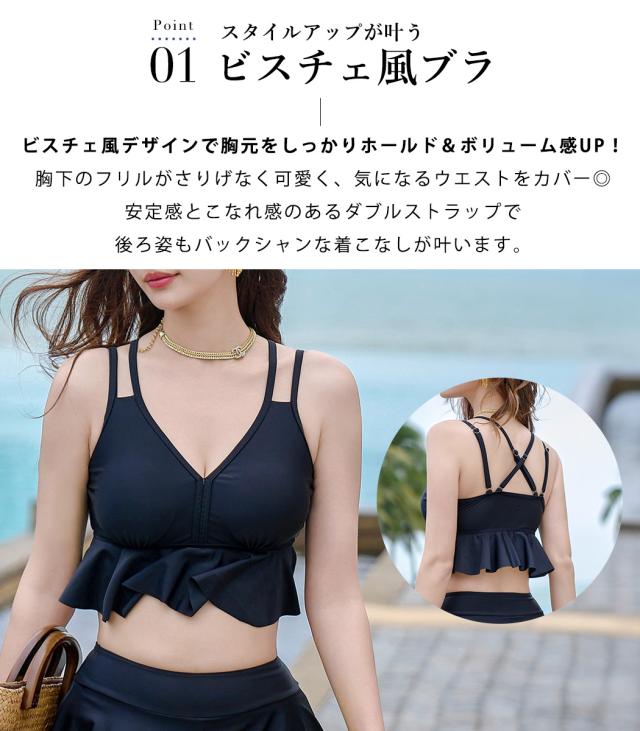 夏新作 水着 体型カバー レディース ブラ スカート ワンピース 3点セット 半袖 ビスチェビキニ フリル フレア バッククロス シアートップス Vネック リボン ノンワイヤー パッド付き バスト 盛れる 二の腕 ウエスト ヒップ 太もも 脚 カバーアップ 黒