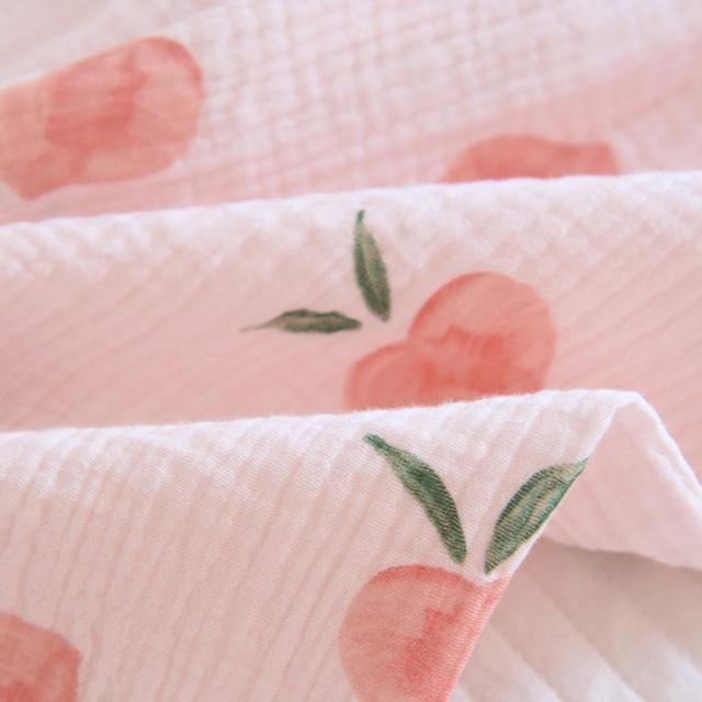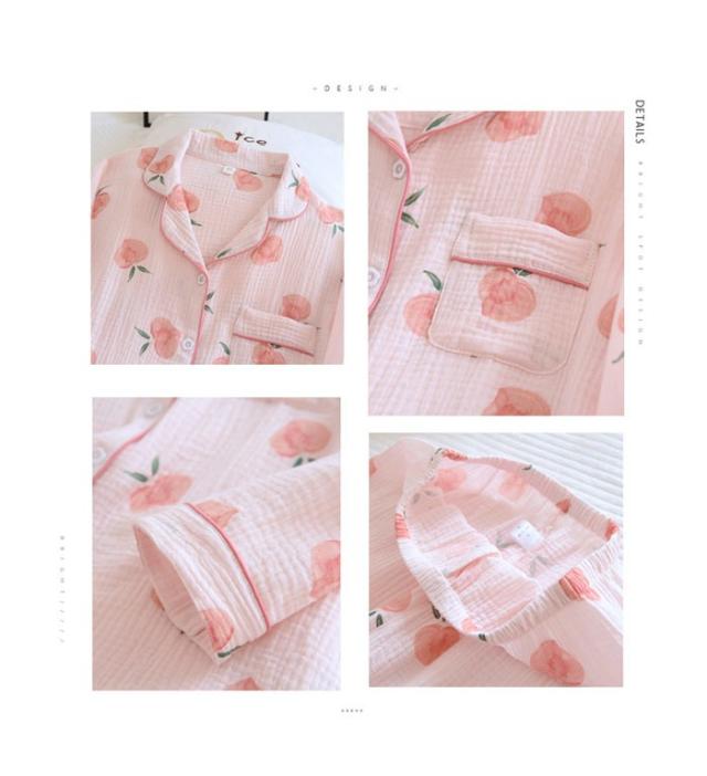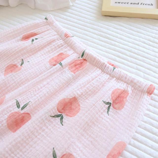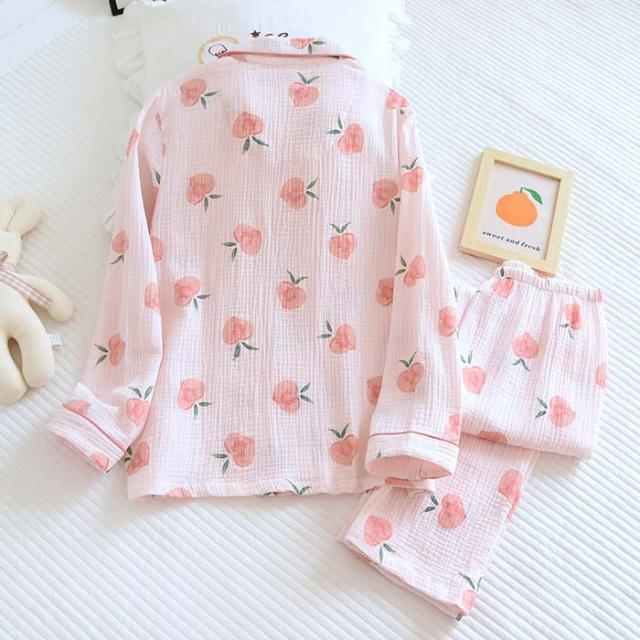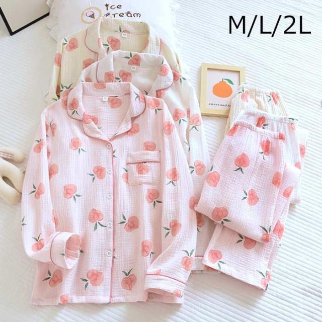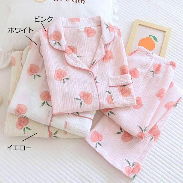 ルームウェア レディース 2層構造ガーゼ パジャマ 前開き 上下セット ピーチ柄 Vネック しわ加工 部屋着 お家時間 長袖 長ズボン 吸湿性 通気性 フルーツ柄 寝巻き M L XL 柔らかい 婦人 女性用 ホワイト ピンク イエロー