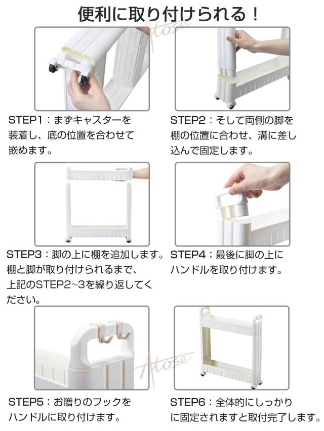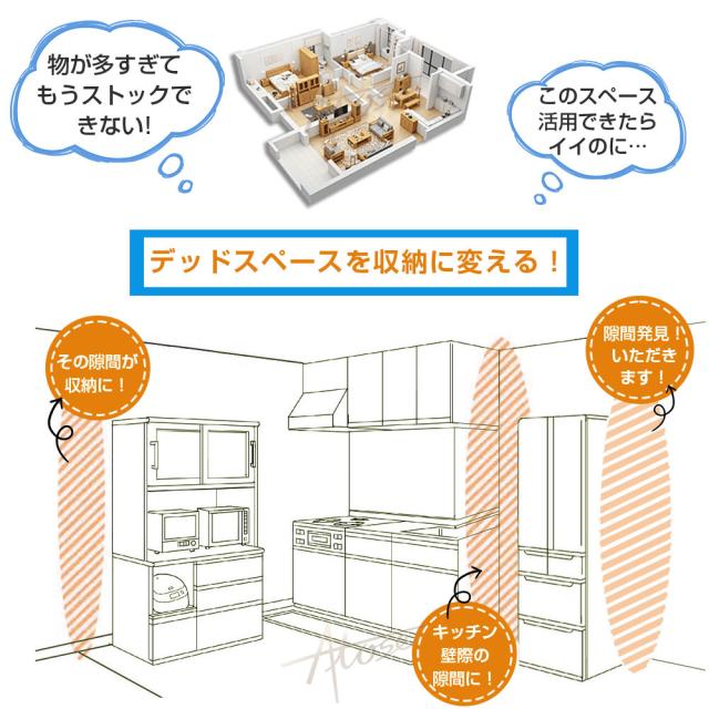 - 組み立ても簡単で、女性でも心配ありません。冷蔵庫の隙間にピッタリ入り、楽々動かせるので掃除も楽にできます。すっきり収納出来、購入して良かったです。