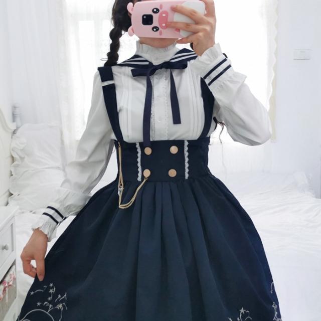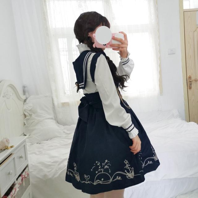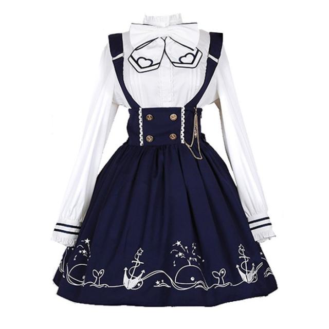 ロリータ セーラー ワンピース Lolita服 ロリ コスチューム ロング 長袖 サスペンダー スカート リボン セーラー襟 蝶結び コスプレ用 撮影 道具 アニメ ハロウイン 文化祭 イベント パーティー アイテム 仮装 変装 演出 衣装 喫茶店 カフェー ネイビー ホワイト dg099zbzbm6