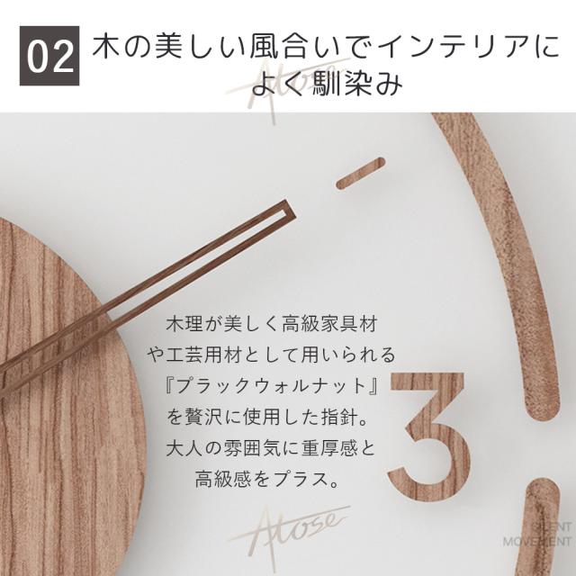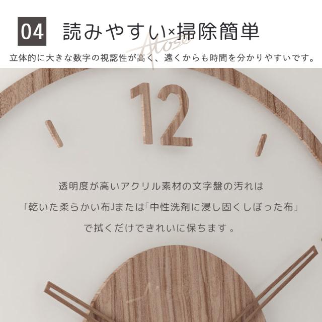 美しいん木目調が映える精練されたモダンデザイン。音がしない静音設計だからどんな部屋にもおすすめの壁掛け時計です。自然と心地よく、シンプルに時を刻む。