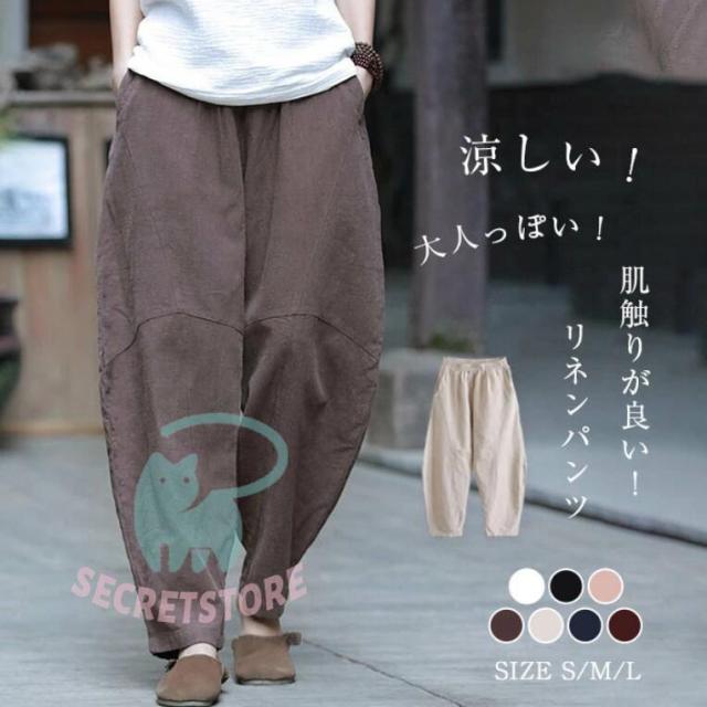 リネンパンツ バルーンパンツ 麻パンツ ロングパンツ ワイドパンツ 春 夏 レディース 綿麻 切り替え カーブパンツ サルエルパンツ