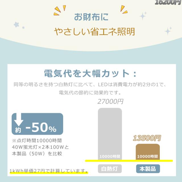 ★最新の50W高効率LEDチップ搭載により、全光束は10000lmを誇ります。従来の蛍光灯40W×2灯相当の明るさを均一に放ち、消費電力を大幅に抑制。約50,000時間の長寿命で交換頻度が減り、コスト削減にもつながります。