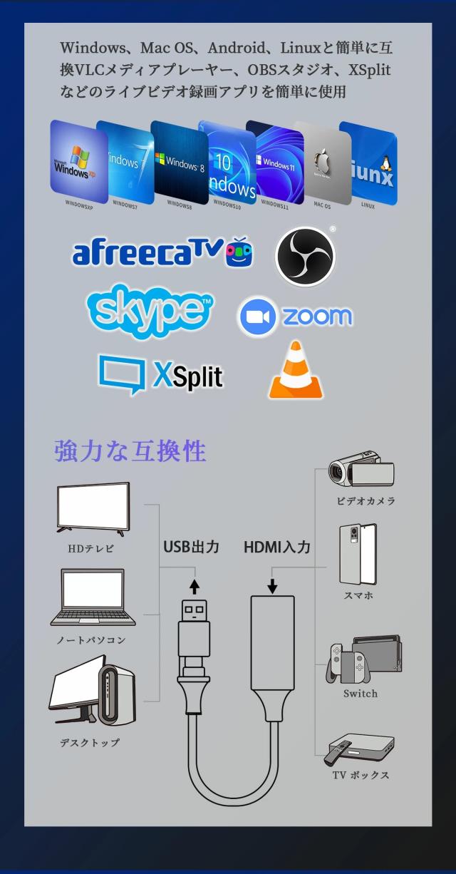 hdmiキャプチャボードでHDMIパススルーとPC録画が高速で簡単に実現できます。Windows、Mac、Android OSと互換性があり、遅れることなく、様々なアプリ&システムに簡単に接続できます。VLCメディアプレーヤー、OBSスタジオ、XSplit、などのライブビデオ録画アプリケーションを使用できます。外出、旅行、会議、飲み会、ライブなど、様々なシーンに活躍されています。