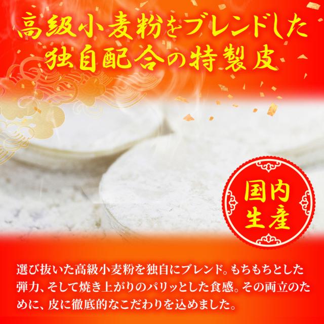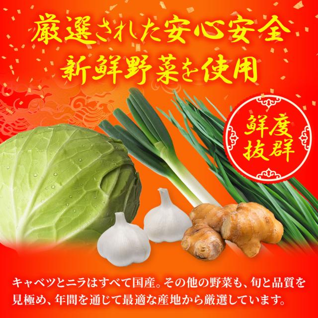 【原材料】具〔野菜(キャベツ(国産)、にら(国産)、ねぎ、にんにく、しょうが)、豚肉(国産)、豚脂、醤油、中華風スープの素、砂糖、ごま油、粒状大豆たん白、パン粉、食塩、発酵調味料、こしょう〕 皮〔小麦粉(国内製造)、でん粉、食塩〕
