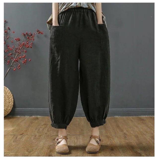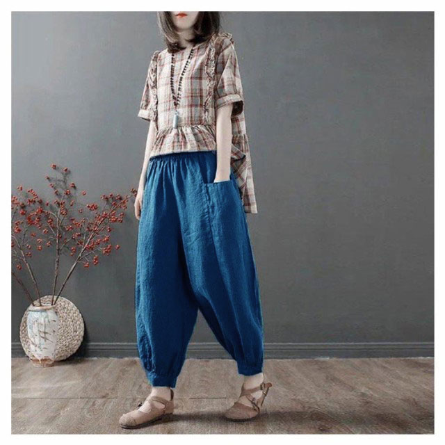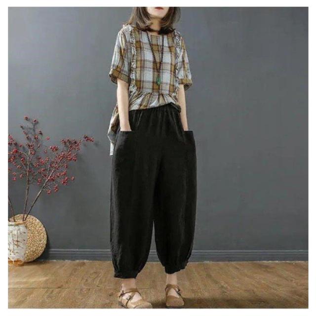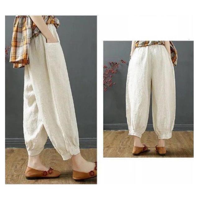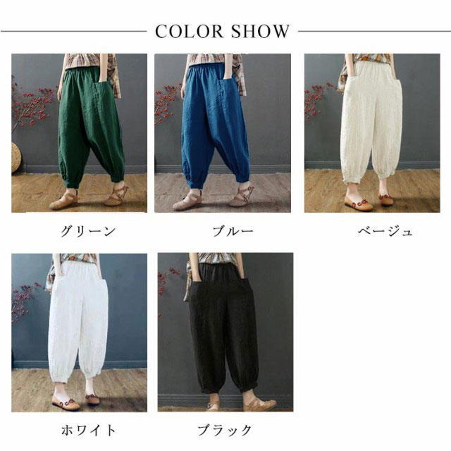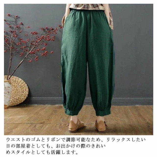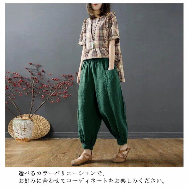 | ゆったりとしたコクーンシルエット、どんな体型にもフィット。 綿麻風の素材を使用した、通気性に優れた薄手の生地で、暑い日でも涼しく過ごせます。 ウエストのゴムとリボンで調節可能なため、リラックスしたい日の部屋着としても、お出かけの際のきれいめスタイルとしても活躍します。 さらに、サルエルパンツのようなデザインが特徴で、動きやすさも抜群。 選べるカラーバリエーションで、お好みに合わせてコーディネートをお楽しみください。 | |