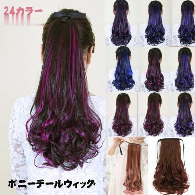 ウィッグ ポニーテール ポイントウィッグエクステ グラデーションカラー ロング 派手 付け毛 リボン式 ツートンカラー カラフル カール 女性 キッズ