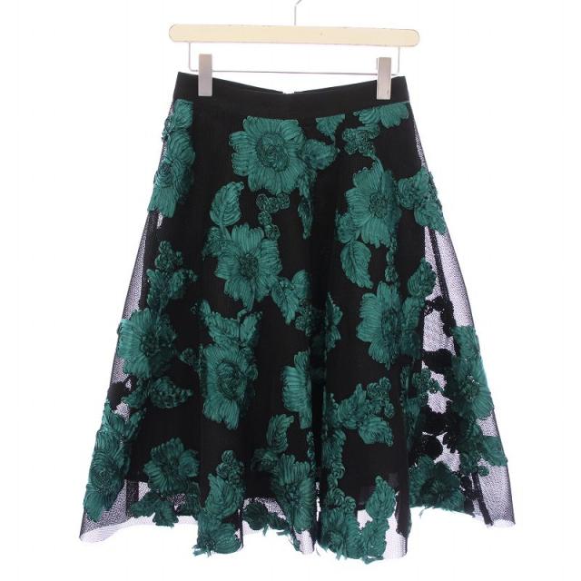 【中古】カワイイ Cawaii 浮き立つお花の華やぎレーススカート フレア イージー ミモレ ロング 花柄 メッシュ 黒 緑