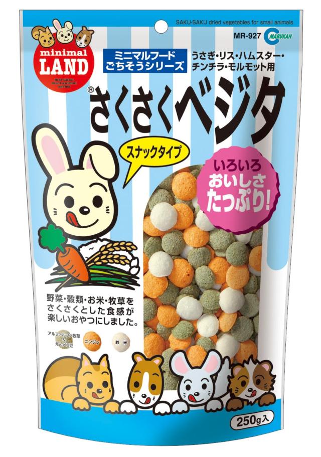 穀類・牧草とにんじん、お米の3種類のスナックをミックスした、サクサクとした食感のおやつ。うさぎなどの小動物の食事の楽しさが広がります。