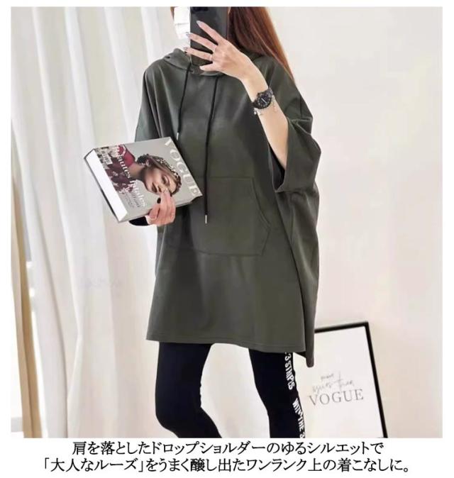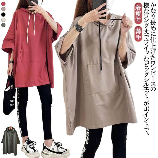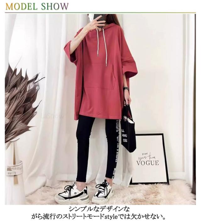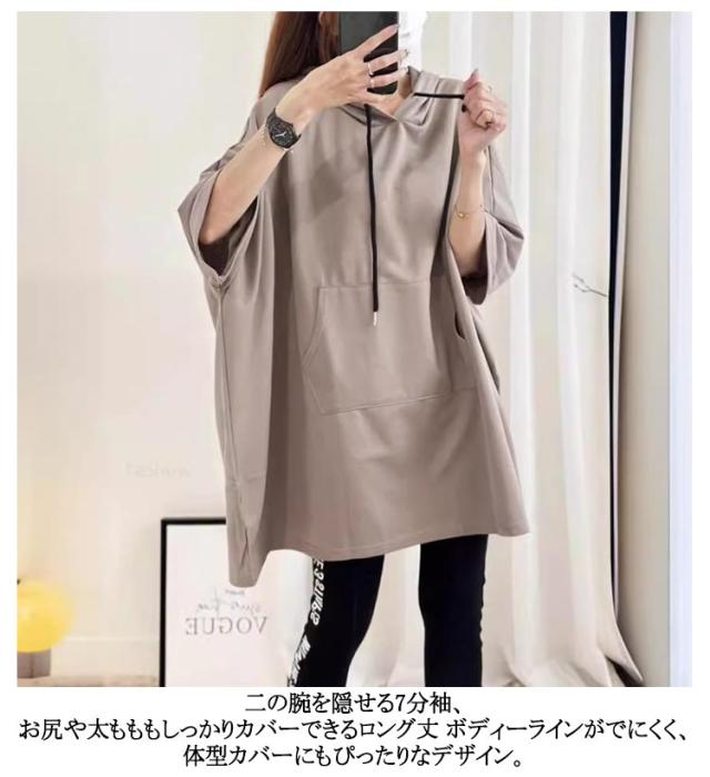 七分袖 チュニック おしゃれ 薄手 フード付き トップス 夏 パーカー パーカー レディース おしゃれ 韓国ファッション 無地 ロング丈 大きいサイズ Tシャツ ロング丈 tシャツ カットソー プルオーバー ゆったり 無地 シンプル 体型カバー