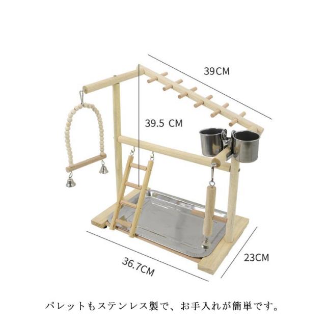 | 鳥用の遊び場です。 環境にもペットにもやさしいナチュラルウッドを使用しています。 ステンレス製の水・エサ入れはクリップでどこでも取り付け可能です。 パレットもステンレス製で、お手入れが簡単です。 底面には滑り止め付きで、安心して遊んでもらえます。 | |