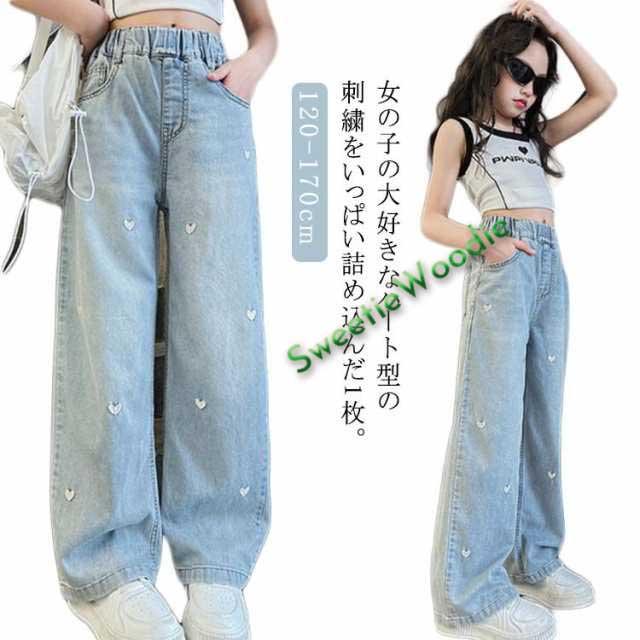 130 秋 ワイドパンツ ロングパンツ 春 ボトムス 夏 キッズ用 ワイド パンツ ロング丈 子供服 デニムパンツ ハート刺繍 ワイド デニム 長ズボン ロング デニムワイドパンツ ワイドデニムパンツ 子供 ハート刺繍 120 キッズ 140 150 160 170 cm