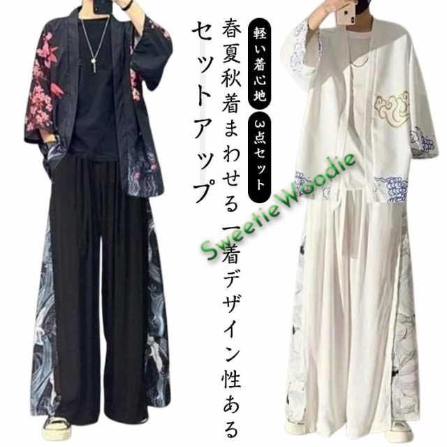セットアップ 和柄 上下セット ハカマパンツ スカーチョ 袴パンツ メンズ ゆったり じんぺい 羽織り 浴衣 3点セット ビッグシルエット カーディガン 甚平 お兄系 スカート風 フレアパンツ ワイドパンツ ホスト ヴィジュアル系 袴 無地 モード系 個性派 ダンス 衣装