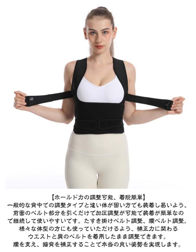 | 美しい姿勢サポート 高粘着マジックテープ 自由に調節可能 姿勢矯正ベルト ・【 長時間の着用で可能な姿勢サポーターができる】デスクワーク、テレワーク、スマホの見過ぎなどで姿勢が悪くなり、結果として猫背や巻き肩になってしまう人が増えています。そんな姿勢が悪くなってしまい困っているという人のために開発されたのが姿勢サポーターです。長時間の同じ姿勢や、間違った姿勢にならないように、着用するだけでサポートしてくれます。美しい姿勢の習慣化で理想の美しい姿勢を造る。 ・【姿勢ブレース機能】1.設計支援は肩と背中と腰の三つ部位を正しい姿勢を助けます。 2.正しい姿勢に戻って肩&背中を引っ張ります。 3.穏やかなバックサポートを提供します。 4.男女兼用の非制限ユニセックスデザイン。 5.マジックテープ調整可能な快適&着やすいです。 ・【ホールド力の調整可能、着脱簡単】一般的な背中での調整タイプと違い体が固い方でも装着し易いよう、前面のベルト部分を引くだけで加圧調整が可能で装着が簡単なので継続して使いやすいです。たすき掛けベルト調整、腰ベルト調整。様々な体型の方にも使っていただけるよう、補正力に関わるウエストと肩のベルトを着用したまま調整できます。腰を支え、猫背を補正することで本当の良い姿勢を実現します。 ・【4つのサイズ】このブレースは、肩幅の広いものと狭いものに合わせて4つの異なるサイズで提供されます。 ・【ソフト&通気性】着用時にムレを大幅にカットする加工が施されており、長時間の装着も可能です。ソフトな素材を加工、皮膚に当たって痛くなったり脇に食い込んだりしづらく、快適にご使用して頂けます。生地素材の匂いがすることがありますが、製品その本体は問題ありません。ベルトをきれいに洗って風通しのいいところで3日間干したらいいです。 | |