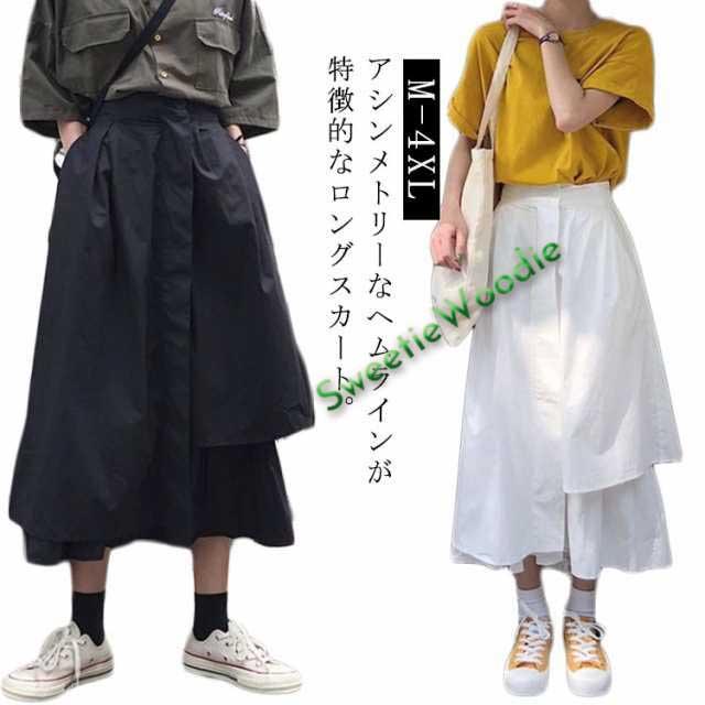 モード系 ウエストゴム アシンメトリースカート ロングスカート Aライン レディース 春夏 ミモレ アシメスカート ゆったり ハイウエスト 体型カバー 無地 カジュアル フレアスカート 黒 白 韓国 ファッション