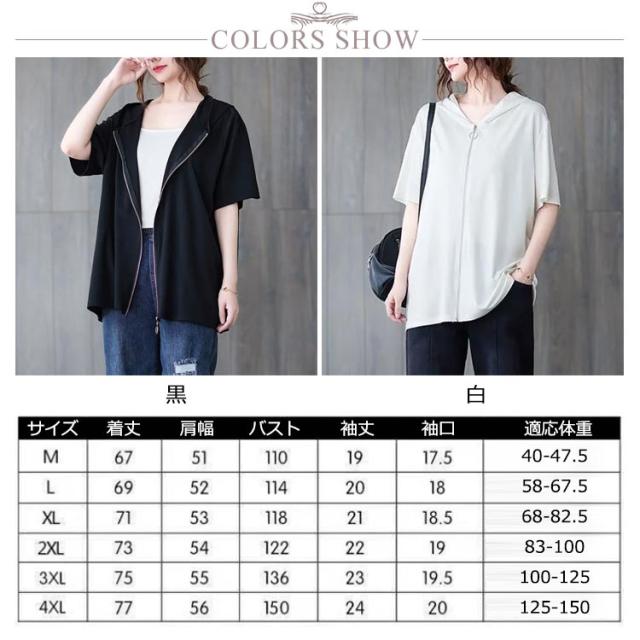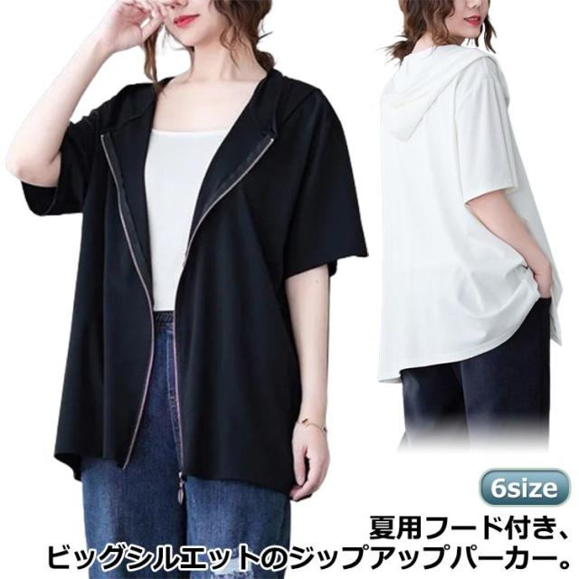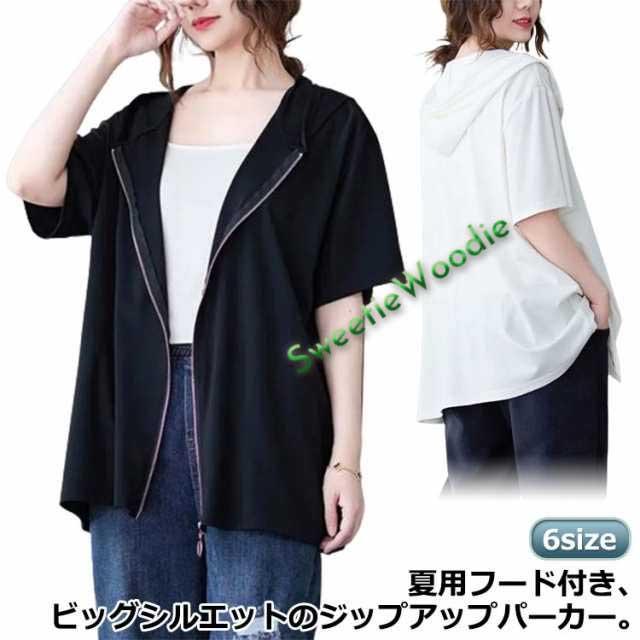カジュアル 黒 前開き ジップアップパーカー 大きいサイズ ビッグシルエット 羽織り 白 フード付きパーカー ビッグシルエット サマーパーカー トップス レディース XL おしゃれ 体型カバー M L 五分袖 2XL 3XL