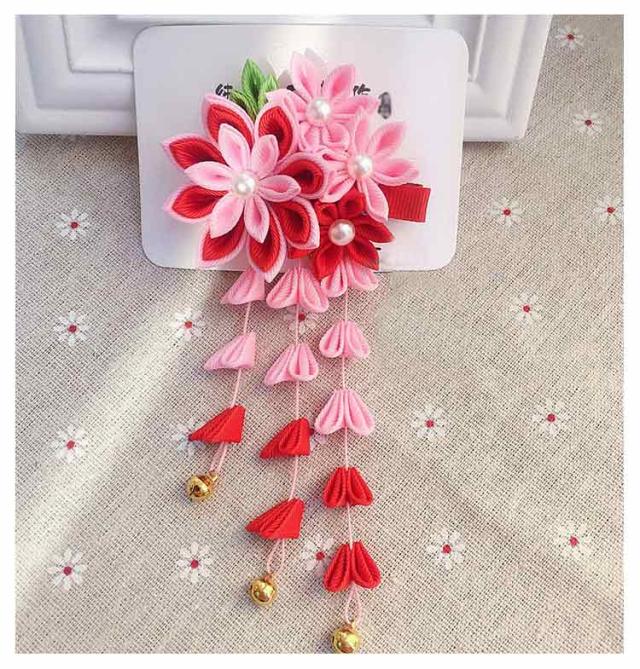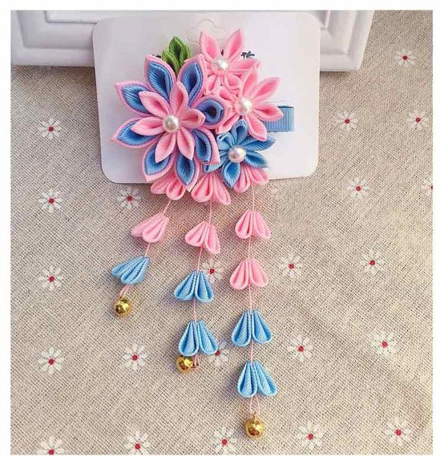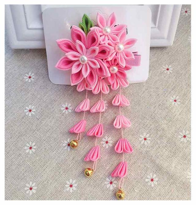 | 七五三や卒園式など、お子様の着物姿に。 色鮮やかなつまみ細工のお花を集めた華やかなパッチン留めかんざし。 | |