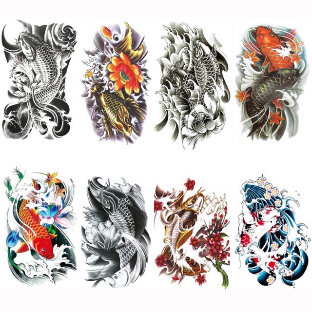 【セット内容】タトゥーシール 鯉 蓮の花、8枚セット。8種類、各1枚。