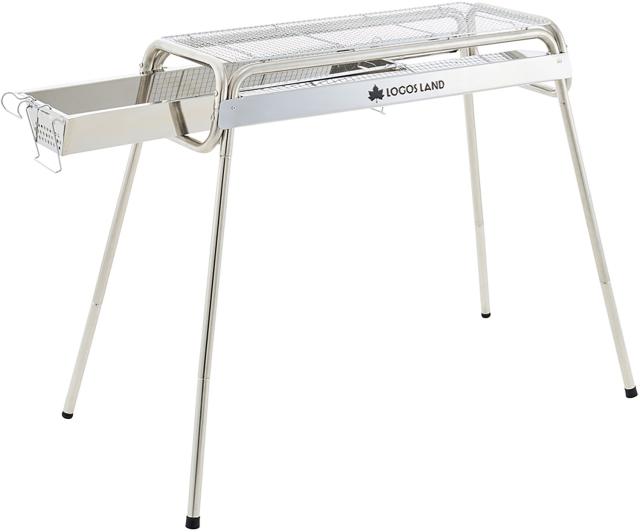 [ロゴスランド]公式アイテム。 使いやすい高さ 80CM !お掃除楽ちん多機能ステンレスグリル。ロゴスランド公式アイテムのグリルは、ネジを使わず簡単に組み立て可能。火力は必要に応じて 2 段階調節が可能で、必要以上に炭を使わないため経済的。スライド式の火床は炭を足すのも捨てるのも簡単に行える。調理しやすい約 80CM のハイポジションと、約 41.5CM のローポジションにも対応。炭焼きグリルプレート付き。ロストル付き。セーフガード構造!危険な火床に直接接触しないように、 4 方向を保護しています。火傷しにくい安全構造です。八の字型脚部で転倒防止!グリルの脚部が八の字型のため、転倒を防ぎます。また、脚先にアジャスターがついているため、凸凹地面