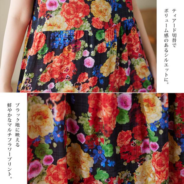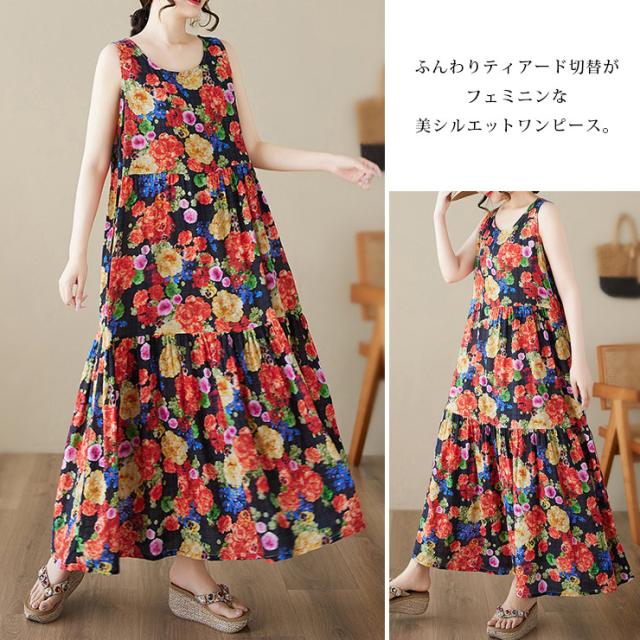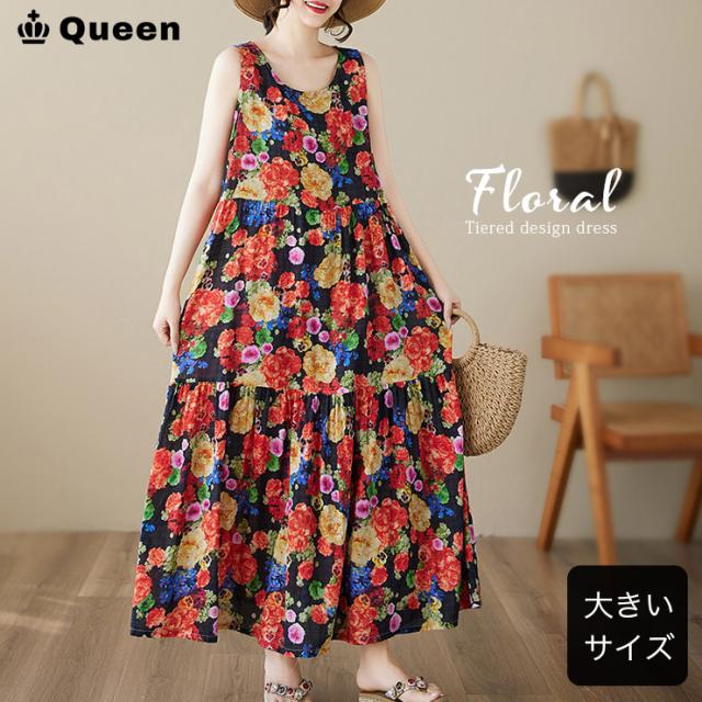 花柄ワンピース ノースリーブ マキシ ティアードワンピ 大きいサイズ ビビットフラワー (388026)