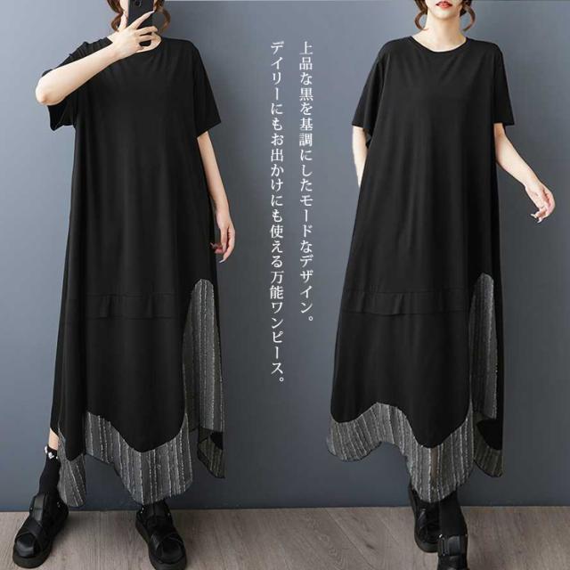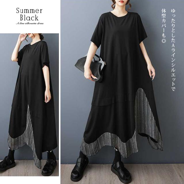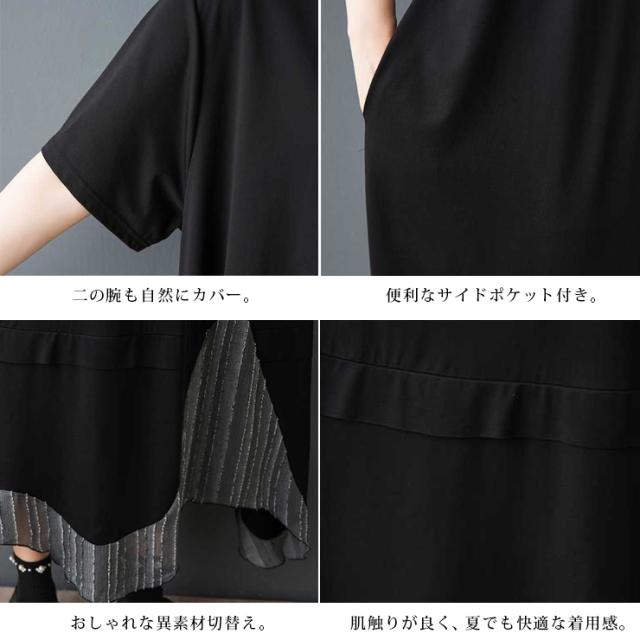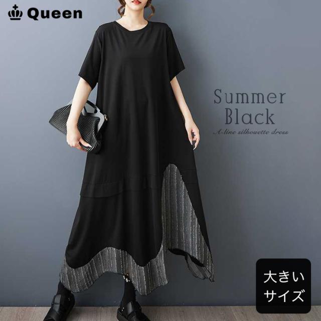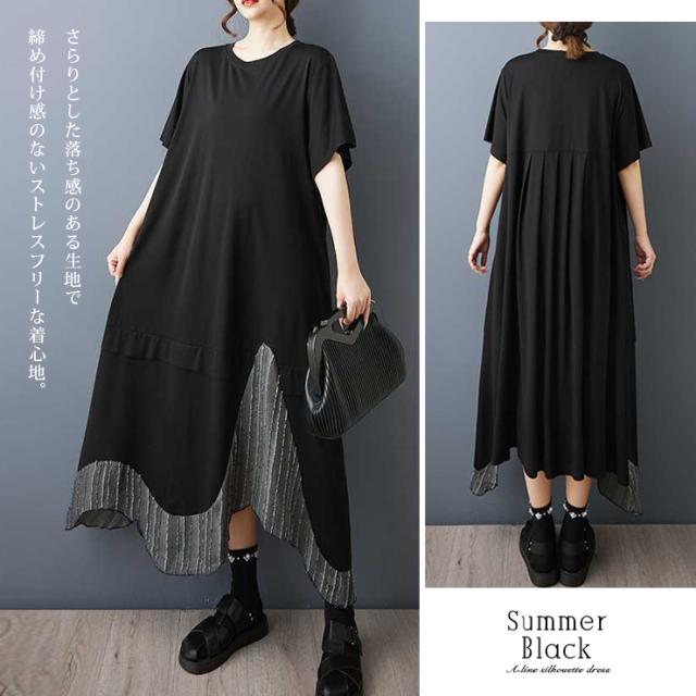 ★☆ワンピース 大きいサイズ レディース アシメワンピ 異素材切り替え フレアワンピ 半袖 Aライン ゆったり 体型カバー 春夏 LL 3L 4L 5L 6L☆★